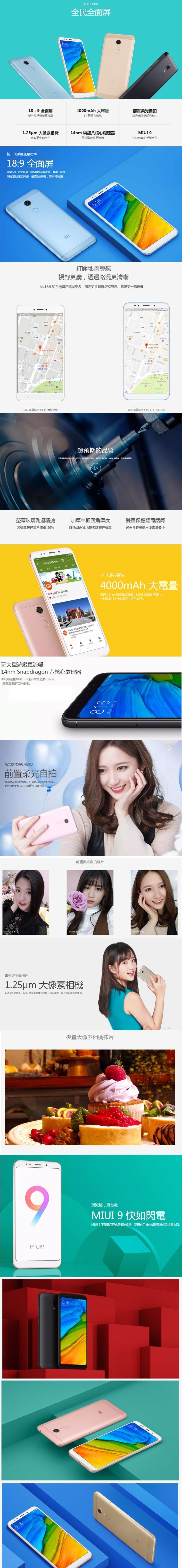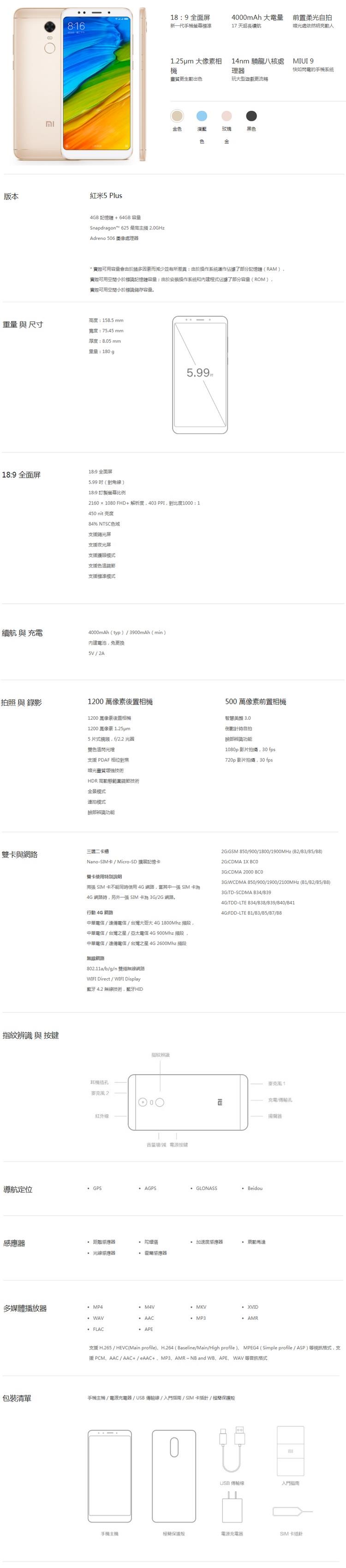 Xiaomi 紅米 5 Plus 5.99 吋八核智慧型手機4G/64G 詳細規格: